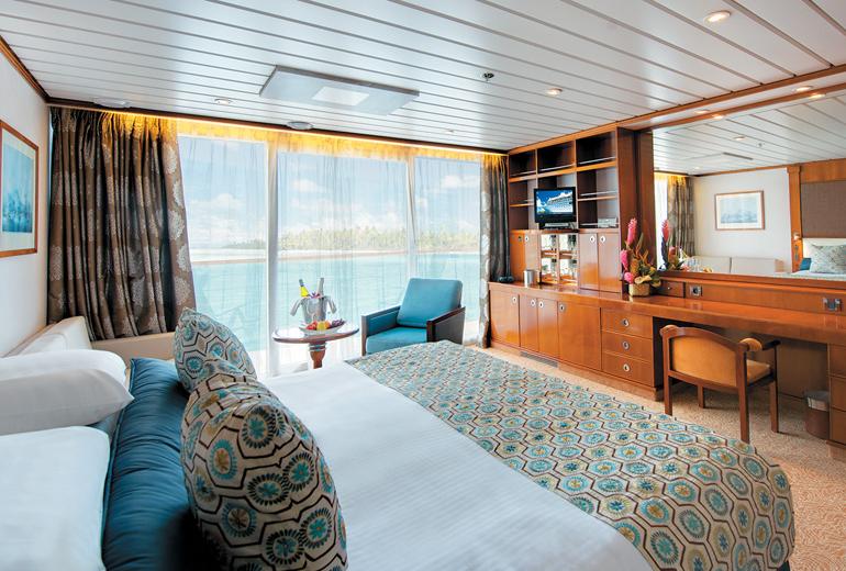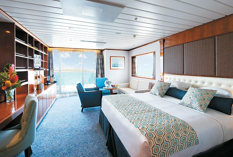 | 2 x GS Grand Suite: Paul Gauguin Suite (801), Flora Tristan Suite (802). Velikost 49m² = Kajuta: 31m² / Veranda: 18m² Max obsazenost 3 osoby. Internet a Butler servis v ceně. | ![]() |