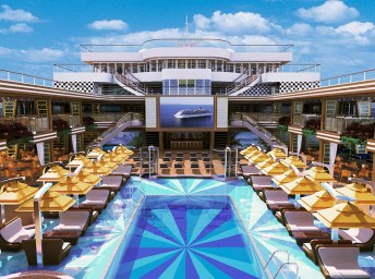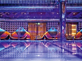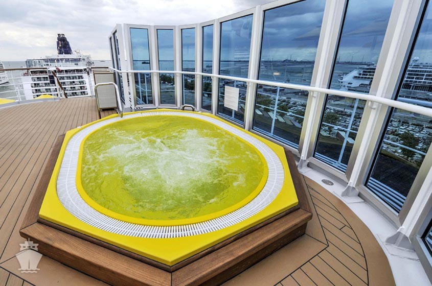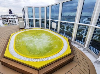 • otevřený bazén na horní palubě, 1 bazén s posuvnou prosklenou střechou, bazén pro děti s vodním miniparkem