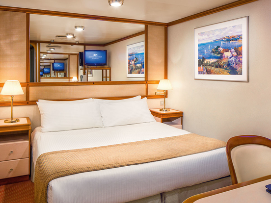 Standardní vybavení kajut: koupelna se sprchou a toaletou, 2 lůžka s možností konfigurace, úložné prostory, minibar, fén, TV.