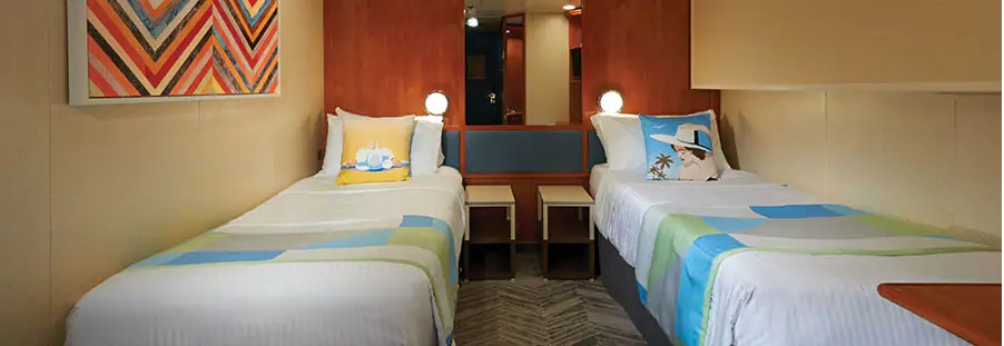 koupelna se sprchou a WC, 2 lůžka, v některých kajutách možnost přistýlek, toaletní stolek, úložné prostory, interaktivní TV, sejf, telefon, vysoušeč vlasů.