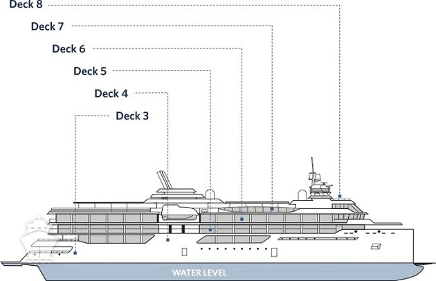 Všechny kajuty jsou apartmány, vybaveny nadstandardně velkými koupelnami a zařízené přírodními, eco-friendly materiály.