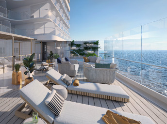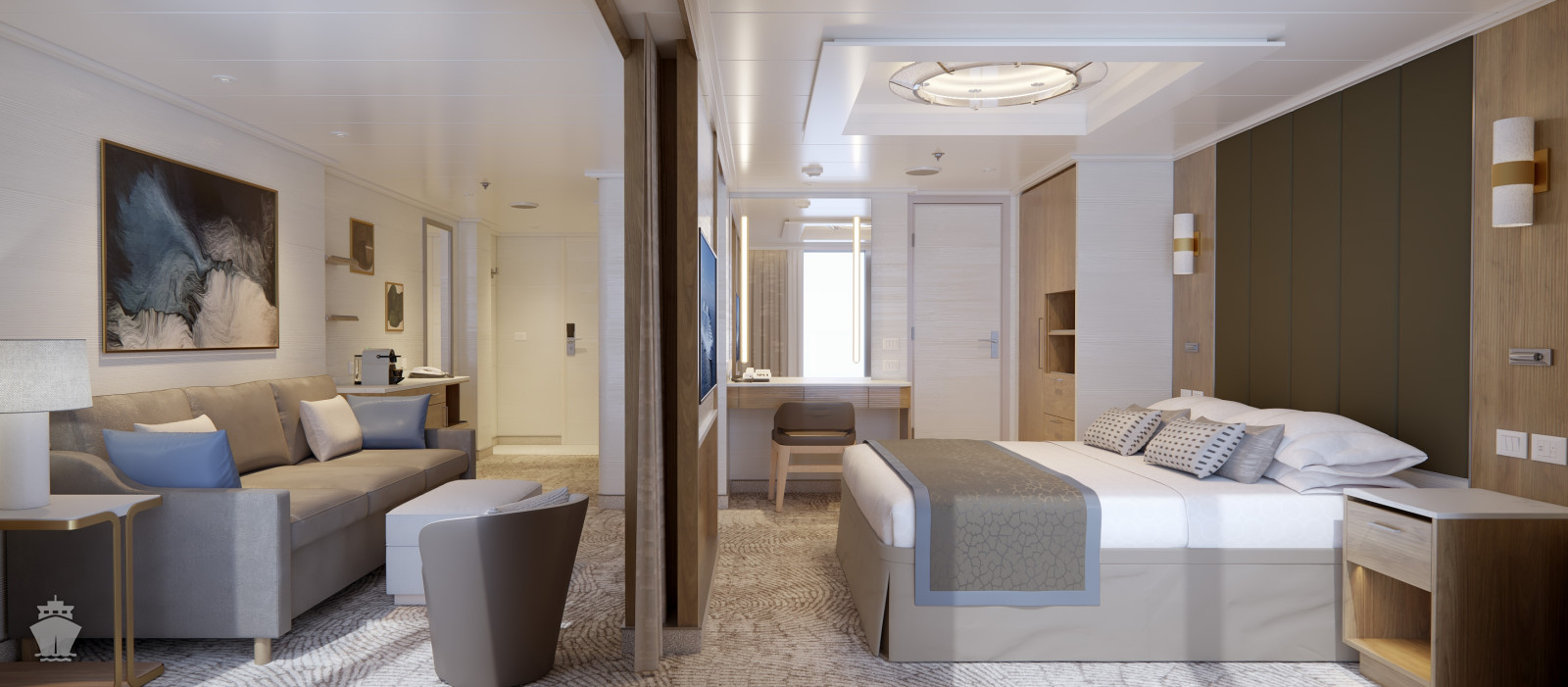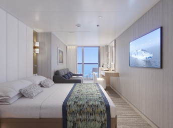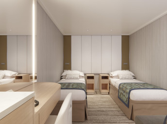 Standardní vybavení kajut: koupelna se sprchou a toaletou, 2 lůžka s možností konfigurace, úložné prostory, minibar, fén, TV, trezor. Balkony je vybaven malým stolkem a 2 židlemi či lehátky.
