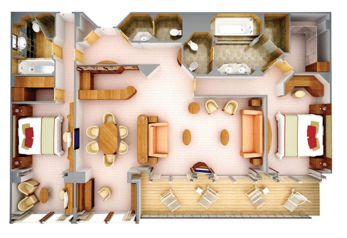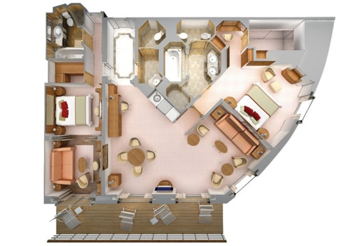 | S2 - Silver Suite 2 100 m² (včetně balkona). 2 ložnice, 2 koupelny, oddělená obývací a jídelní část. Horní paluby. | 566 471 Kč 283 236 Kč za osobu |