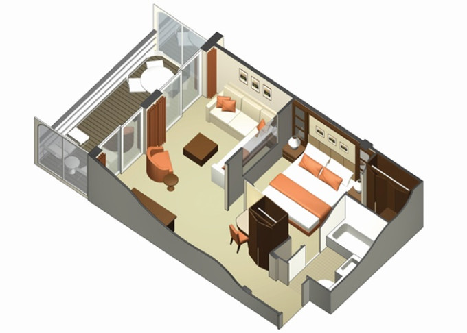 SS - Sky Suite Sunset 28 m² / balkon 7 m². 6. až 12. paluba na zádi. Max 2-4 osoby. Výhody Suite. 234 559 Kč 117 280 Kč za osobu