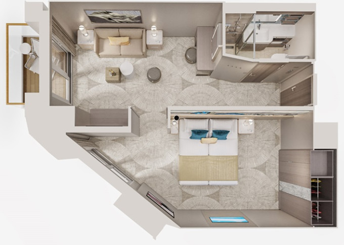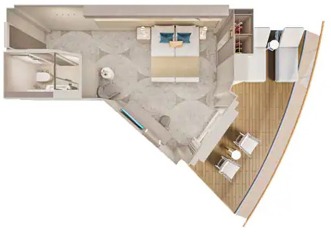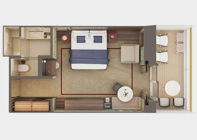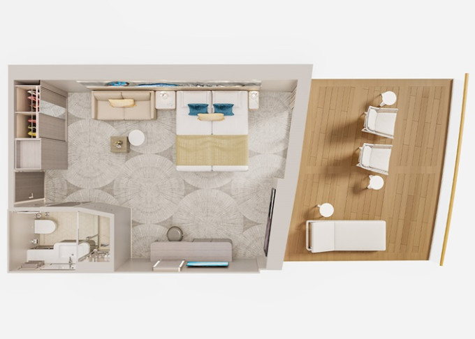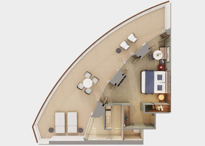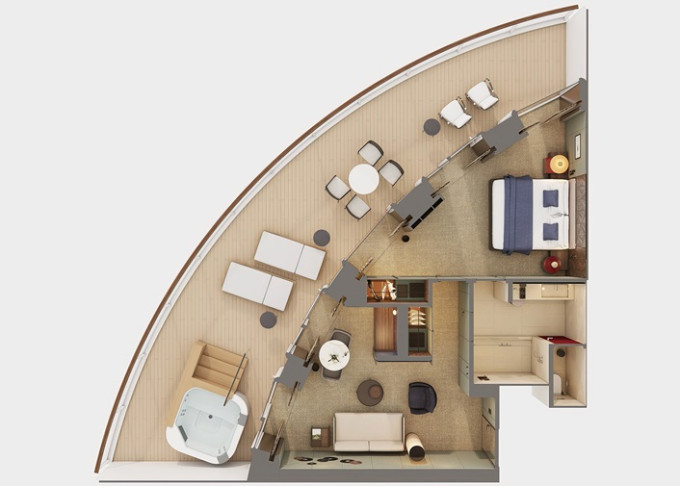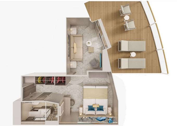 | SH - Suite s velkým balkónem Aft-Facing 59 m² / balkón 34 m². Výhody Suite. 9. paluba - vzadu. Max 4 osoby. | 119 260 Kč 59 630 Kč za osobu |