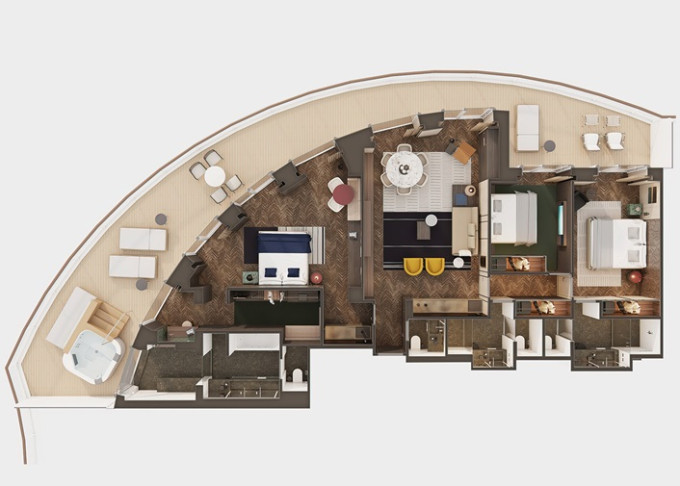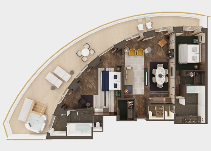 | H3 - Suite THE HAVEN DELUXE OWNER'S s balkónem 149-162 m² / balkón s vířivkou 57-68 m². Výhody The Haven. 13/15. paluba - vzadu. Max 6 osob. | 416 732 Kč 208 366 Kč za osobu |