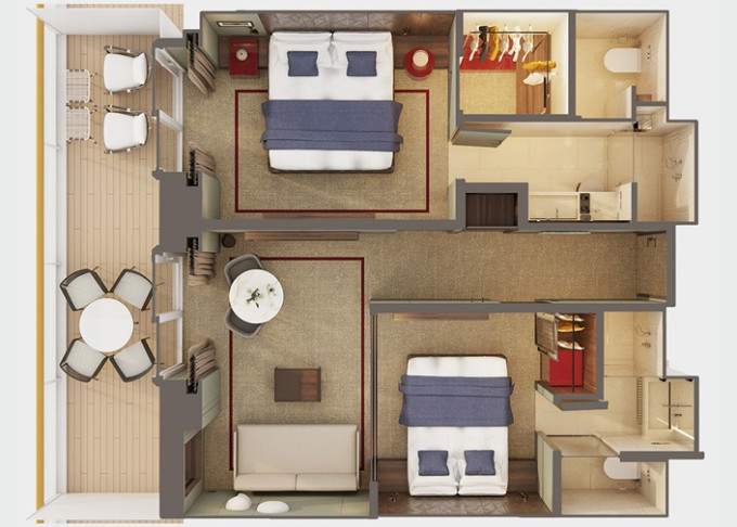 | SJ - Family Suite s oddělenou ložnicí a balkónem 36 m² / balkón 4 m². Oddelená ložnice. 9. až 16. paluba - střed. Max 4 osoby. | 114 347 Kč 57 173 Kč za osobu |