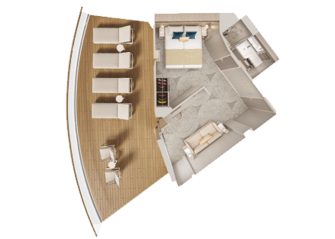 | SK - Suite s velkým balkónem Forward-Facing 38-45 m² / balkón 14-18 m². Oddelená ložnice. Výhody Suite. 9. až 13. paluba - vpředu. Max 4 osoby. | 97 102 Kč 48 551 Kč za osobu |