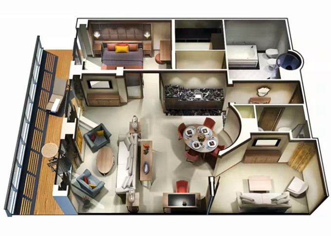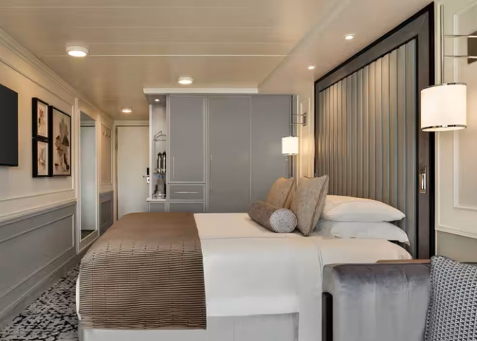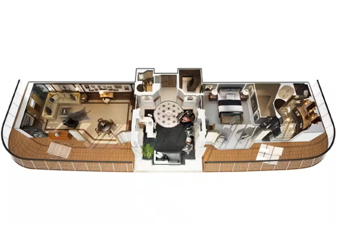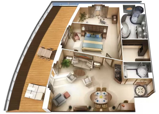 | OS - Owner’s Suite 123 m² + balkon s vířivkou od 62 m². Výhody Owners Suite. 8/9/10. paluba. Max 2-3 osoby. 4 izby: vstupná hala s pianom, ložnice, velká obývací místnost s jídelní částí, 2 koupelny (1 s vířivkou), 2 šatníky. | 1 296 818 Kč 648 409 Kč za osobu |