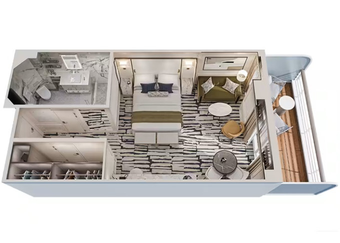 | PH1 - Penthouse Suite 32 m² + balkon 7 m². Výhody Penthouse Suite. 11. paluba. Max 2-3 osoby. Ložnice s předělenou obývací částí, koupelna se sprchovým koutem. | 613 544 Kč 306 772 Kč za osobu | ||