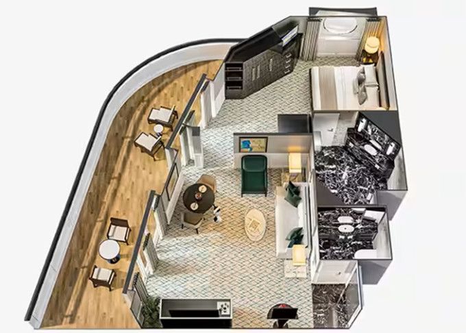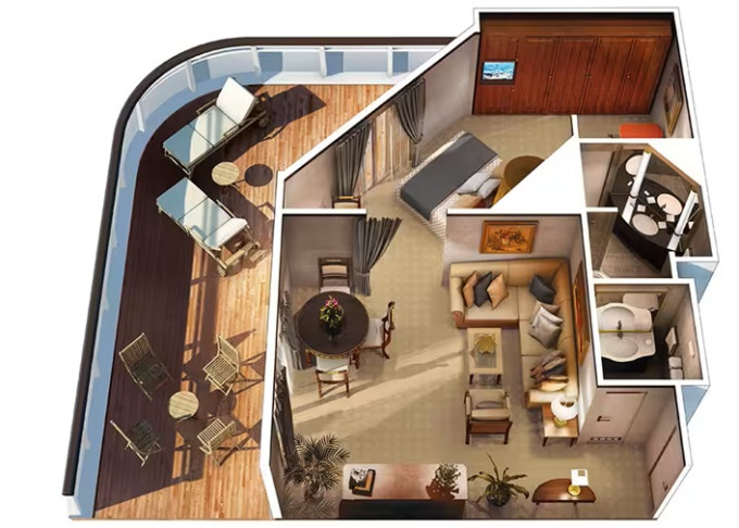 | OS - Owner’s Suite 58 m² + rohový balkon 32 m². Výhody Owners Suite. 6/7/8. paluba vzadu. Max 2-4 osoby. Ložnice, předělená obývací a jídelní část, onyxová koupelna se sprchovým koutem a vířivkou, extra wc. | 526 818 Kč 263 409 Kč za osobu | ||