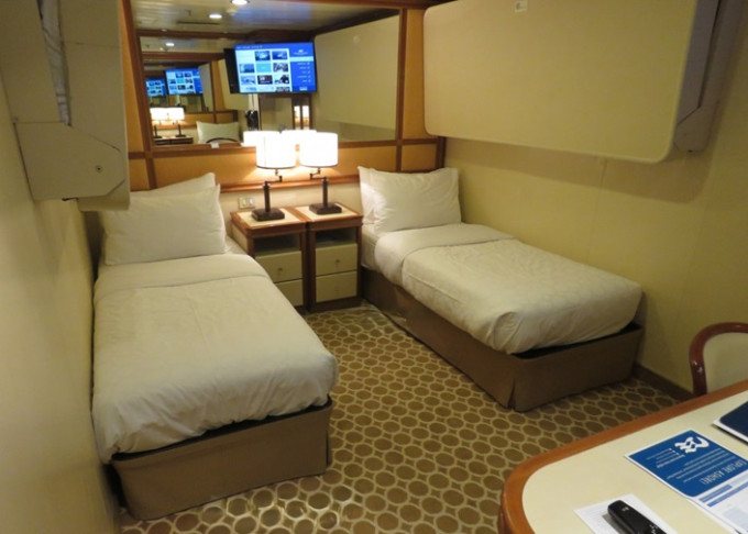 Standardní vybavení kajut: koupelna se sprchou a toaletou, 2 lůžka s možností konfigurace, úložné prostory, minibar, fén, TV.
