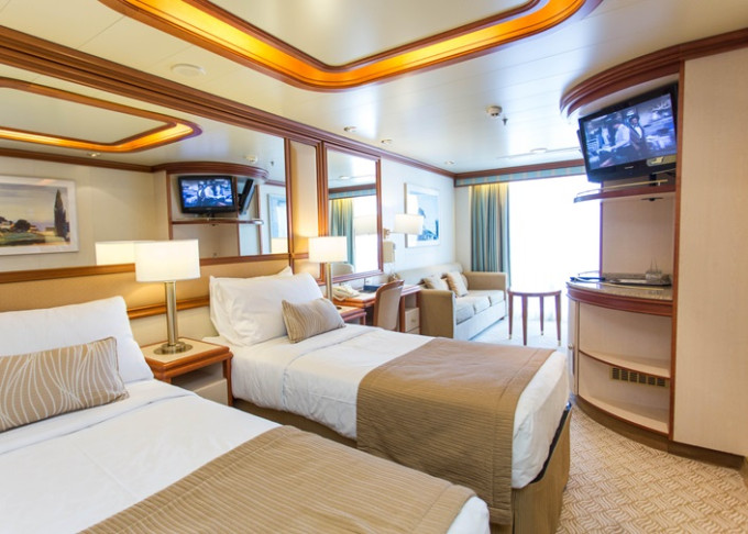 Standardní vybavení kajut: koupelna se sprchou a toaletou, 2 lůžka s možností konfigurace, úložné prostory, minibar, fén, TV.