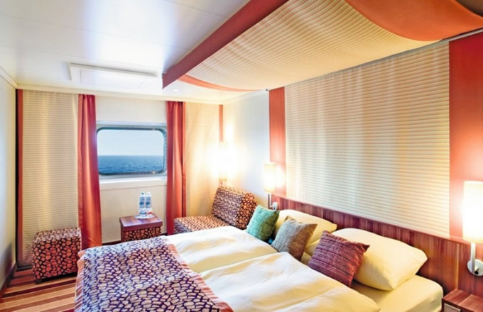Ve všech kajutách se nachází koupelna se sprchou, 2 pevná lůžka a v některých kajutách též 2 přistýlky ve formě sklopných lůžek či rozkládacího sofa, úložné prostory, trezor, vysoušeč vlasů, telefon, TV, regulovatelná klimatizace.