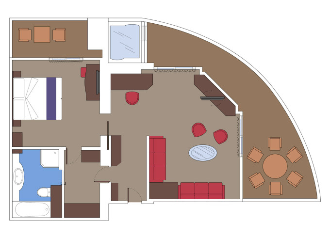 | YC3 - Yacht Club Royal Suite 58 m² + rohový balkon s vířivkou 70 m². Oddělená obývací část a ložnice, šatník, koupelna s vanou a sprchou. 15. paluba. Cenový model MSC Yacht Club. | 258 922 Kč 258 922 Kč za osobu |