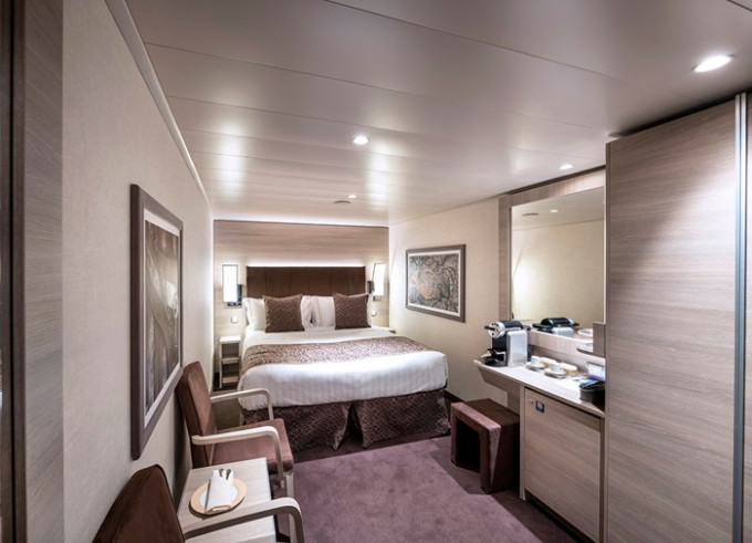 Kajuta vnitřní: 17 m², kajuta s manželskou postelí (na požádání 2 oddělené postele) a 1-2 vyklápěcí horní lůžka. Klimatizace, koupelna se sprchou a WC, toaletní stolek, skříň, interaktivní TV, sejf, telefon, vysoušeč vlasů, virtuální asistentka ZOE.