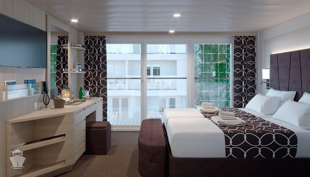 Kajuta s balkónem: 16 - 17 m², kajuta s manželskou postelí (na požádání 2 oddělené postele) a rozkládací pohovka. Klimatizace, koupelna se sprchou nebo vanou a WC, toaletní stolek, prostorná skříň, interaktivní TV, telefon, sejf, vysoušeč vlasů, virtuální asistentka ZOE. Balkony se stolkem a židlemi. Některé kajuty mají omezený výhled; kajuty PR1, PR2, PR3, PV mají výhled na promenádu.