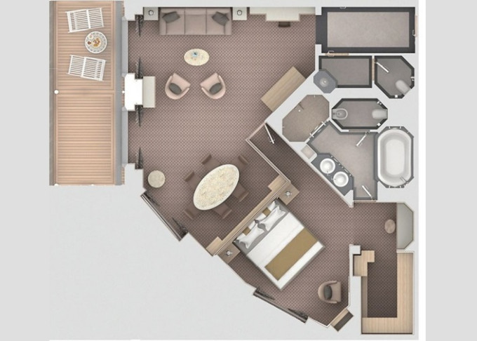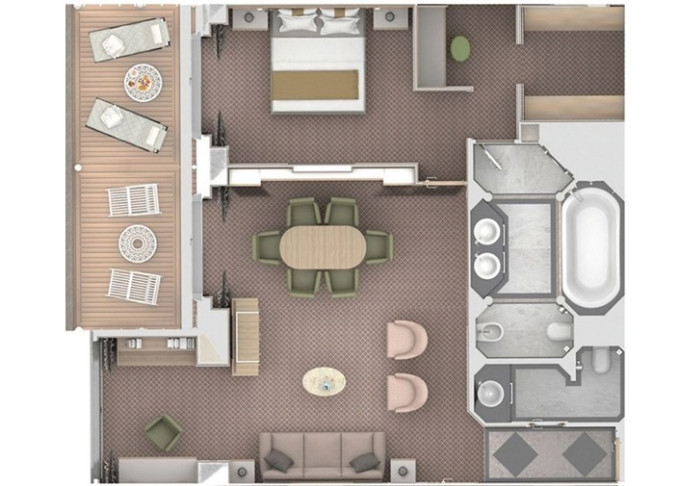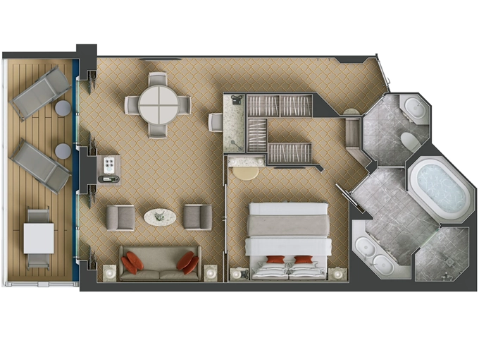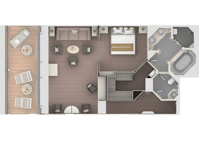 | SV - Superior Veranda Suite 36 m² / balkon 6 m². Vyšší paluby. Ložnice s obývací částí. | 411 068 Kč 205 534 Kč za osobu | ||