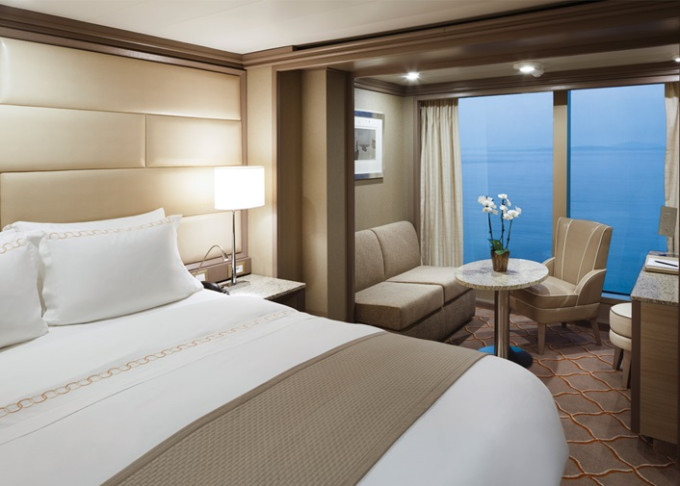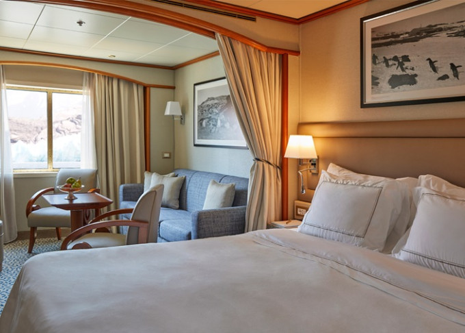 | VI - Vista Suite s oknem 32 m². Panoramatické neotevíratelné okno. 4. paluba. Ložnice s obývací částí. | 365 950 Kč 182 975 Kč za osobu | ||