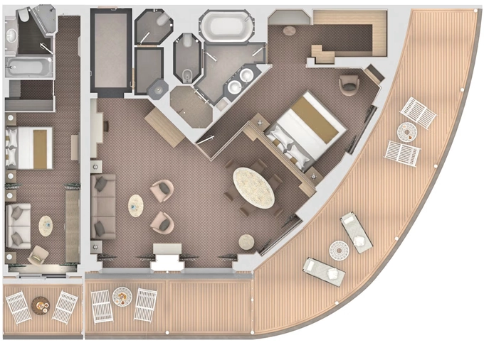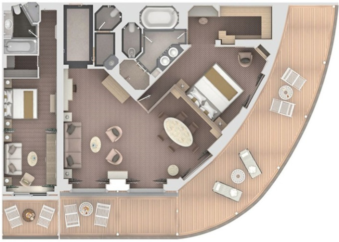 | R2 - Royal Suite 2 142 m² (včetně 2 balkonů). Royal Suite prepojená s Veranda Suite. | 1 122 916 Kč 561 458 Kč za osobu |