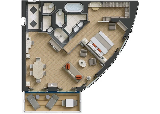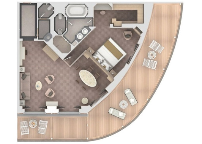 | R1 - Royal Suite 1 105 m² (včetně balkona). Ložnice, oddělená obývací časť. | 947 461 Kč 315 820 Kč za osobu | ||