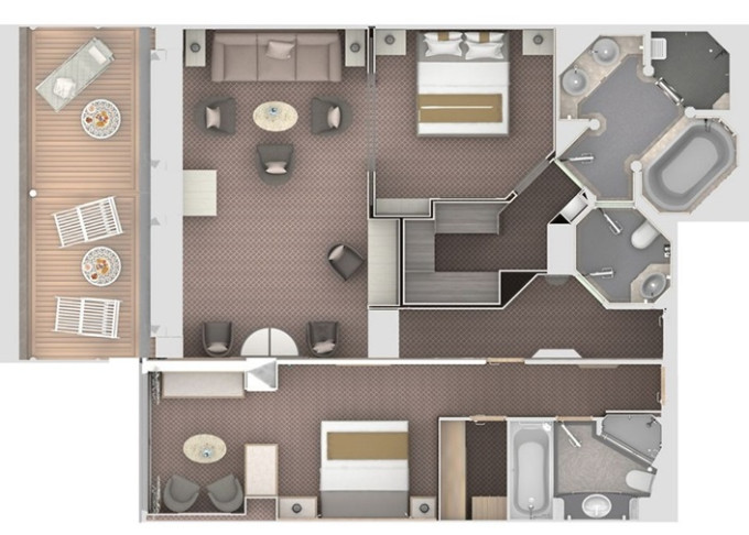 | R1 - Royal Suite 1 105 m² (včetně balkona). Ložnice, oddělená obývací časť. | 631 641 Kč 315 820 Kč za osobu | ||