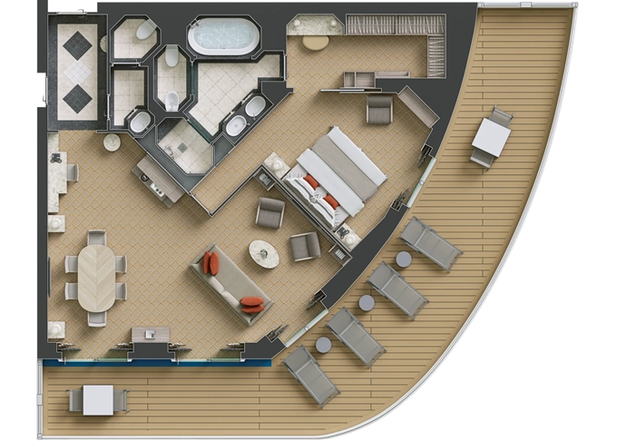 | O1 - Owner's Suite 1 88 - 98 m² (včetně balkonu). Ložnice, oddělená obývací a jídelní část. | 832 161 Kč 416 081 Kč za osobu | ||
