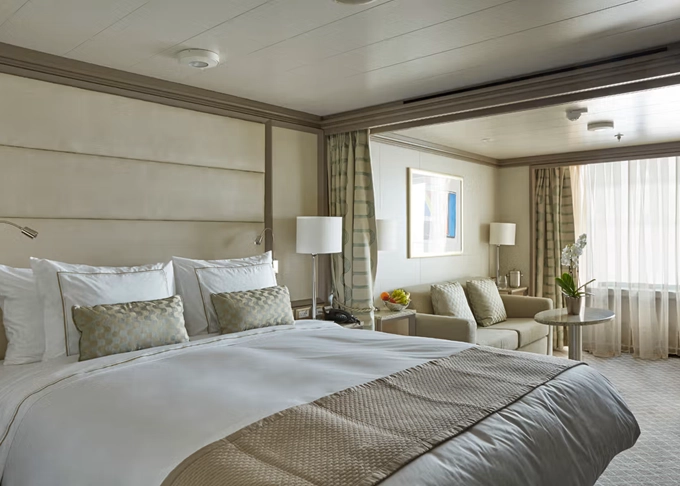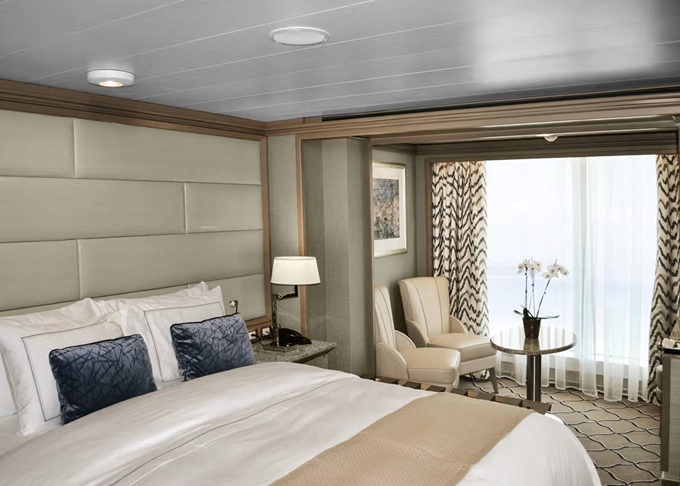 | VI - Vista Suite s oknem 32 m². Panoramatické neotevíratelné okno. 4. paluba. Ložnice s obývací částí. | 320 207 Kč 320 207 Kč za osobu | ||