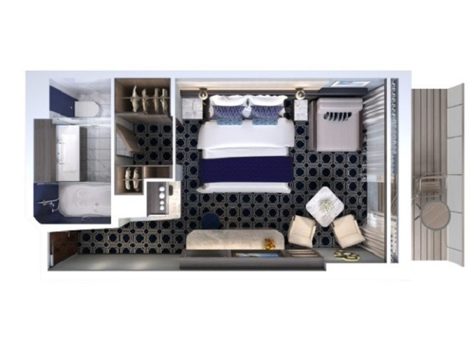 | B1 - Kajuta s balkonem Aft-facing od 20 m² / balkon od 4 m². 9. až 15. paluba - vzadu. Max 2-3 osoby. | 57 199 Kč 28 599 Kč za osobu | ||