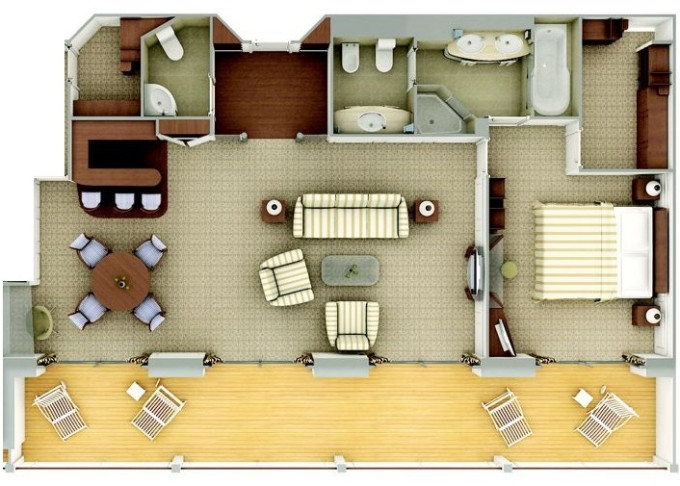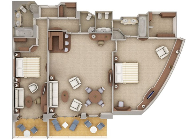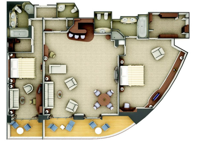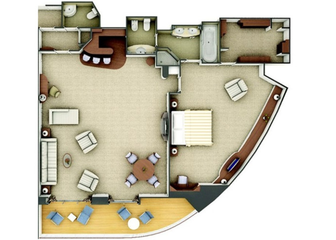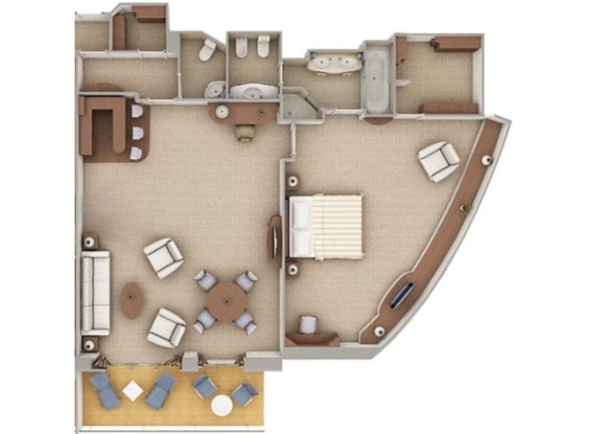 | O1 - Owner's Suite 1 85 m² (včetně balkonu). Ložnice, oddělená obývací část a jídelní část, vírívka. | 1 418 685 Kč 709 342 Kč za osobu |