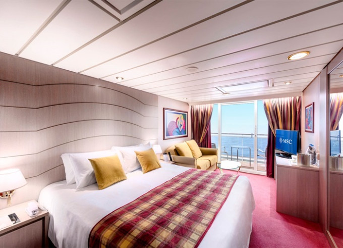 Suite s balkónem: cca 23 m², kajuta s manželskou postelí (na požádání 2 oddělené postele) a rozkládací pohovka. Klimatizace, koupelna s vanou a WC, toaletní stolek, prostorná skříň, interaktivní TV, telefon, minibar, sejf, vysoušeč vlasů. Balkon se stolkem a židlemi.