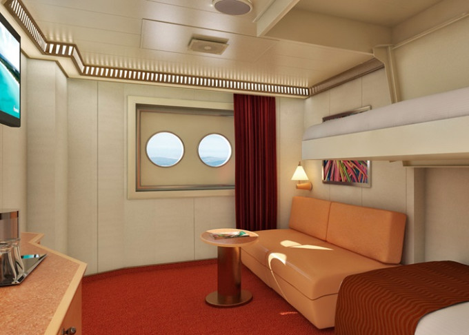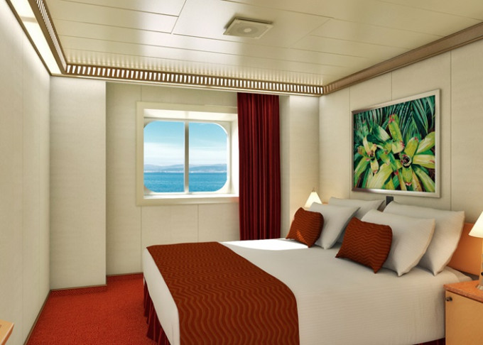 Základní vybavení všech kajut: koupelna se sprchou a WC, TV s plochou obrazovkou, telefon, elektrická zásuvka 110 AC, regulovatelná klimatizace, postele Carnival Comfort, vysoušeč vlasů, trezor.