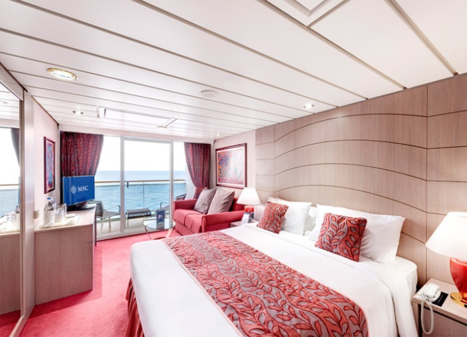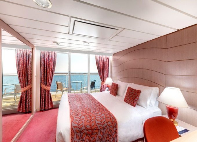 Suite s balkónem: cca 27 m², kajuta s manželskou postelí (na požádání 2 oddělené postele) a rozkládací pohovka. Klimatizace, koupelna s vanou a WC, toaletní stolek, prostorná skříň, interaktivní TV, telefon, minibar, sejf, vysoušeč vlasů. Balkon se stolkem a židlemi.