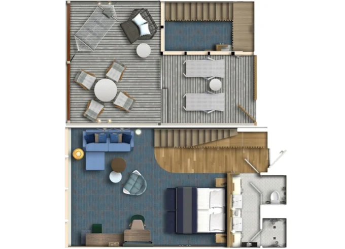 | SUHO - Himmel & Meer Suite 42 m² + prekrytá terasa 29 m² v patře se stolem, lehátky a s houpací sítí. Ložnice s obývací částí a jedálenským kútom. 14. paluba. Max 4 osoby. Výhody Suite. | 477 846 Kč 119 462 Kč za osobu | ||