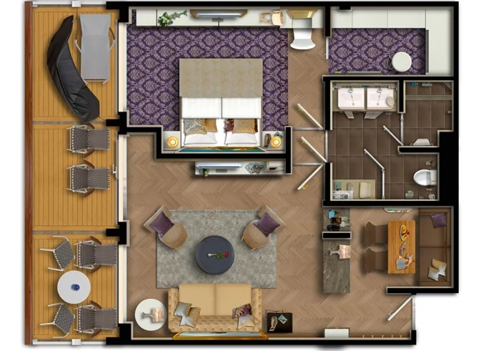 | SUTO - Themen Suite 54 m² + balkon 15 m² se stolem, lehátkom a houpací sítí. Ložnice, Obývací část, šatník. 10. paluba. Max 4 osoby. Výhody Suite. | 423 238 Kč 105 810 Kč za osobu |